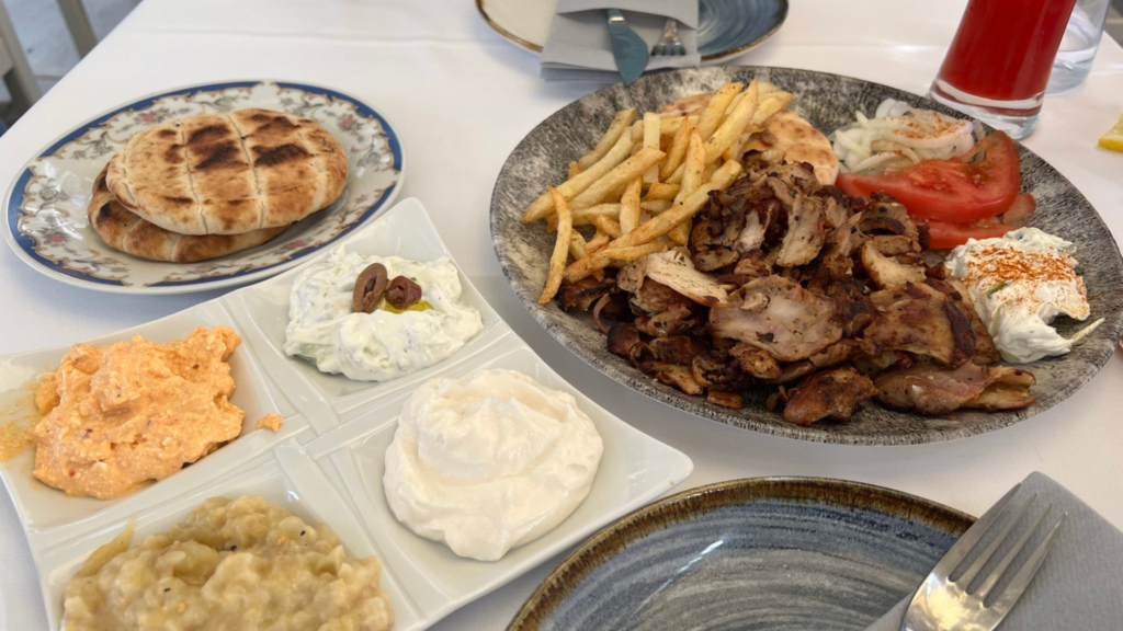 After the museum, we walked through Plaka and stopped at Kosmikon for a real lunch! We had a variety of dips, which included tzatziki, eggplant, spicy cheese (which tasted like pimento cheese), and tarama (which tasted like mayo). We also had the gyros, which was a mix of pork and chicken, this was the best tasting gyros we had all trip!