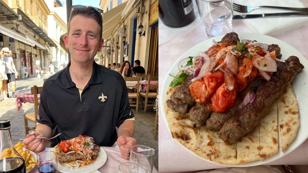 Once we woke up it was time to explore and find dinner. We headed toward Monastiraki Square, which was close by and had shops, restaurants and bars. After we walked around we headed to O Thanasis for dinner. Cody and I both got the Thanasis Kabab, which is what they are known for. And it was delicious! It was 4 juicy kababs, with pita, onions and tomato. We also got a side of fries and tzatziki.
